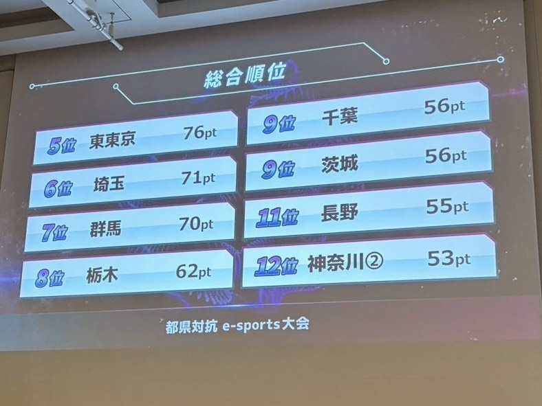 また、学会中に都県対抗e-sports大会が開催され、群馬県からも7人で参加しました。レースゲームとパーティバトルゲームの2種類のゲームで対戦し、惜しくも決勝戦に進むことはできませんでしたが、会場は非常に盛り上がっていました。